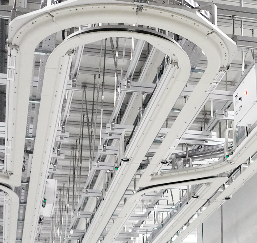 The OHT (Overhead Hoist Transport) track system is adeptly suspended from the clean room's ceiling, comprising straight and curved tracks, a non-contact power supply, and a communication network.